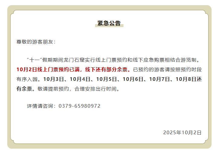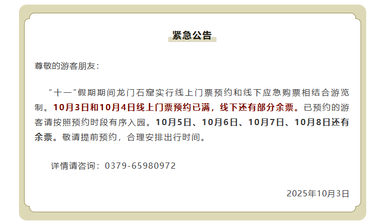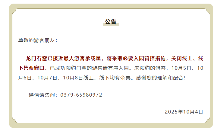 10月4日,洛陽(yáng)龍門石窟官微公告:龍門石窟已接近最大游客承載量,將采取必要入園管控措施,關(guān)閉線上、線下售票窗口。