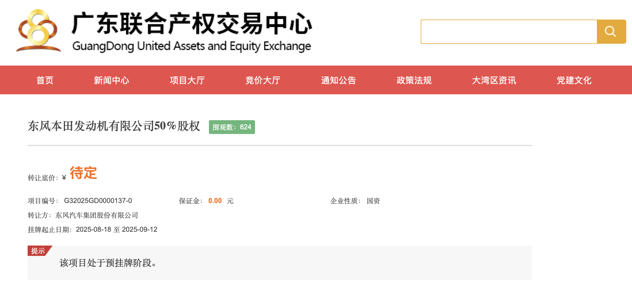 東風(fēng)汽車擬出售持有的東風(fēng)本田發(fā)動機(jī)有限公司50%股權(quán)。廣東聯(lián)合產(chǎn)權(quán)交易中心官網(wǎng)截圖。東風(fēng)東風(fēng)