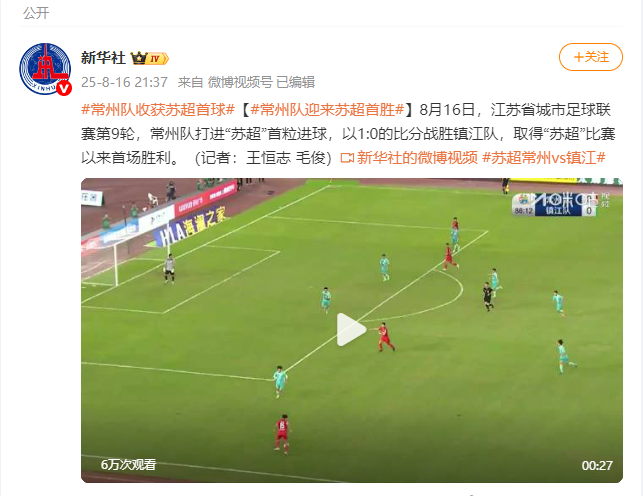 據(jù)@新華社 消息,蘇超8月16日,常州場勝江蘇省城市足球聯(lián)賽第9輪,隊比隊取得比常州隊打進(jìn)“蘇超”首粒進(jìn)球,戰(zhàn)勝鎮(zhèn)江以1:0的賽首比分戰(zhàn)勝鎮(zhèn)江隊,取得“蘇超”比賽以來首場勝利。利新(記者:王恒志 毛?。?/p>
