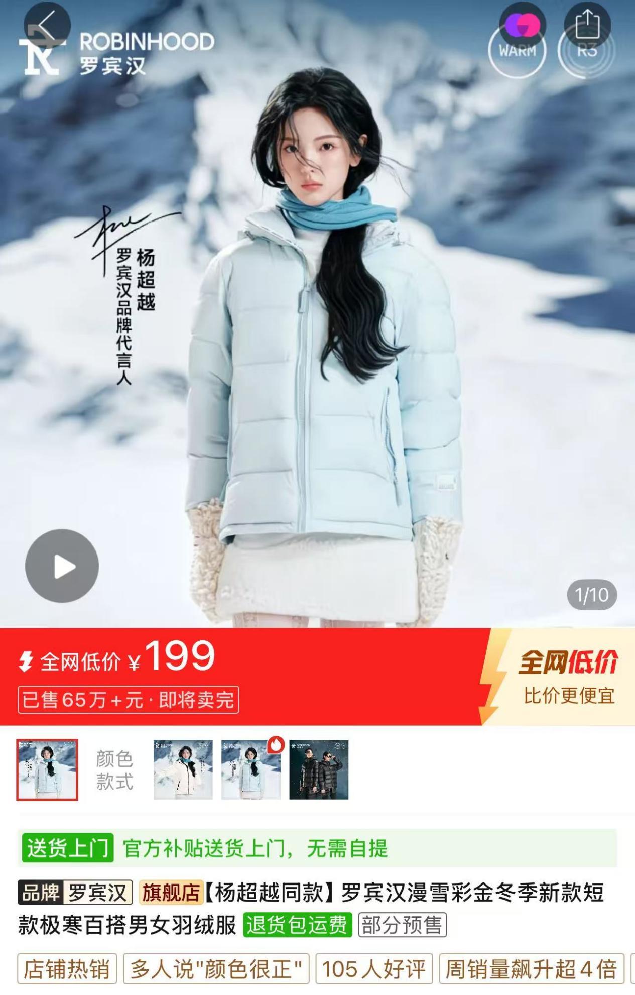 2022年,徐忠團(tuán)隊(duì)以八千萬(wàn)元買(mǎi)斷羅賓漢股權(quán),徹底重構(gòu)運(yùn)營(yíng)模式,從傳統(tǒng)批發(fā)轉(zhuǎn)向全線上直營(yíng)銷售。品牌化首年銷售額約3億元,2023年銷售額突破15億元,實(shí)現(xiàn)大幅躍升。之后,選擇楊超越作為品牌代言人,其青春靚麗形象帶動(dòng)了彩色系羽絨服銷量大幅攀升,2024年全年GMV達(dá)到驚人的45億元。